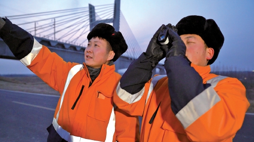 王志奔和同事正在使用望远镜对大桥设备进行检查。