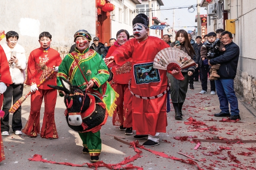你看他的扮相便知:一身鲜艳的戏服,脸上化着浓妆,滑稽搞笑的形象,活泼夸张的动作,幽默风趣的唱词,重要的是他不时与围观的观众互动着,给大家惊喜。“两人一驴便成戏”,那头“驴子”也在他与搭档的操纵下,跟随着剧情时而跩尾蹦天,时而尥蹶子撒欢儿,在鼓锣、小镲、唢呐和笙等乐器的伴奏下,逗得大家捧腹大笑。