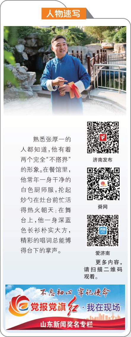 走上了省级舞台的张厚一,给自己的定位仍然是那个扎根最基层、“顶着高粱花子”的普通演员。一大早,他买菜、掌勺,忙活着快餐店的生意;晚上一收工,他摘下厨师帽和围裙,在店门口一站,手里的“四页板”一打,一段精彩的山东快书张口就来,引得周围叫好声不断……