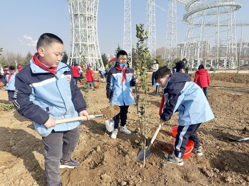 春暖大地,万物生长。3月12日是我国第46个植树节,莱芜区花园学校三(4)中队师生一起参加植树活动,为美丽家园添新绿的同时,种下绿色希望、种出美好未来。 (本报记者 张宪政 通讯员 薛莲 摄)