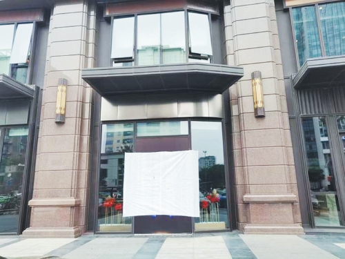 有听花酒体验店宣传广告已被白苫布遮盖。(赵桂凯 摄)