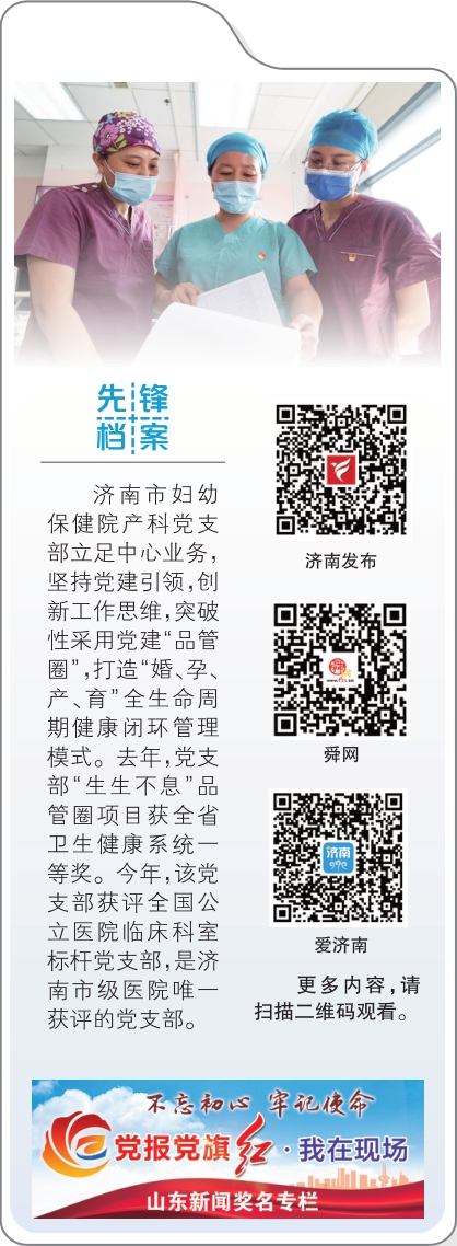 济南市妇幼保健院产科党支部立足中心业务,坚持党建引领,创新工作思维,突破性采用党建“品管圈”,打造“婚、孕、产、育”全生命周期健康闭环管理模式。去年,党支部“生生不息”品管圈项目获全省卫生健康系统一等奖。今年,该党支部获评全国公立医院临床科室标杆党支部,是济南市级医院唯一获评的党支部。