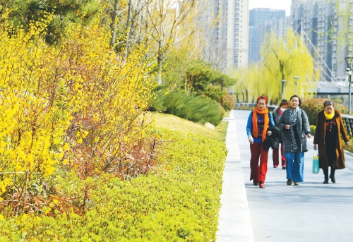 3月17日,市民在春意盎然的小清河畔散步游玩。随着气温回升,小清河两岸连翘等春花竞相绽放,垂柳也吐出新叶,人们漫步其中宛如进入画卷。(本报记者 崔健 摄)