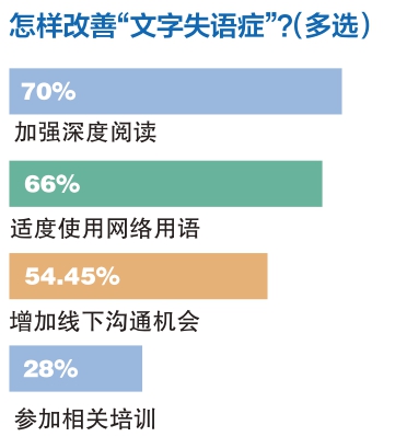 哪些方式可以改善年轻人的“文字失语症”?加强深度阅读、适度使用网络用语、增加线下沟通机会等,都是受访者们认为有用的方式。
