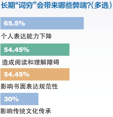 我平时用表情包或网络用语比较少,但在年轻人中这种情况还是很普遍的,我觉得久而久之可能会影响到语言表达能力,导致书面语言也渐渐不规范。“词穷”现象需要社会共同关注,引导青少年多进行深度阅读,提升自我。