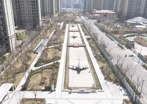 公园南区入口打造文化长廊,通过展示中国战机发展史让游客了解空军文化,沿路保留原有的水泥跑道170米,通过景观手法进行二次设计,融合机场跑道符号、导航等设施还原机场跑道场景,沿跑道科普展示曾在张庄机场服役的战机模型,进行航空科普、国防军事及爱国主义教育。在公园南地块纪念广场,通过展示张庄机场原驻扎部队6位空军战斗英雄的雕像和英雄事迹,以及“空中铁拳精神”展示,传承红色基因。