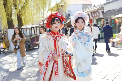 簪花围,穿花衣,踱步曲水亭街,体验非遗簪花文化。3月19日,济南天气回暖,在曲水亭街如织的游人里多了“簪花”姑娘的身影。盛开的“繁花”,装扮了老街的繁华。姑娘们扮上簪花装,优雅出街,当一回“泉水公主”,她们觉得这是拥抱春天的最美方式。(本报记者 赵晓明 摄)