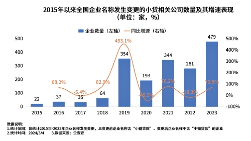 与此同时,小额贷款相关公司陆续更改经营范围和变更企业名称,寻求多元化发展路径。企查查数据显示,2015年至2018年,我国企业名称发生变更的小额贷款相关公司数量分布在22家至64家之间。2019年至2023年这5年共有1651家小额贷款相关公司企业名称发生变更。其中,2019年发生企业名称变更的相关企业数量同比激增453.13%达到354家,此后年度增速虽有放缓,但数量波动增加。2023年,我国累计有479家小额贷款相关公司企业名称发生变更,达2015年以来最高峰,小额贷款相关公司转型数量整体走高,行业进入全面调整期。