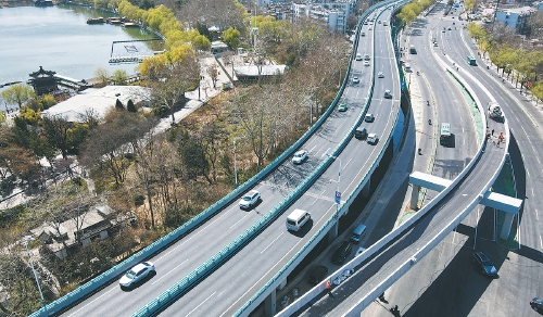 3月19日,在济南明湖北路与北关北路交叉口,顺河高架经一路新建下桥匝道在主体结构完工后,已经开始铺设首层沥青路面。该项目施工起点位于生产路以东约120米中央绿化带处,终点位于北关北路以东约200米顺河高架路处,预计4月份具备投用条件。新匝道建成后,可分流北园高架路北向西、南方向的车流,将主线交通提前分离,避免交通积压,从而改善区域交通出行条件。 (本报记者 崔健 摄)