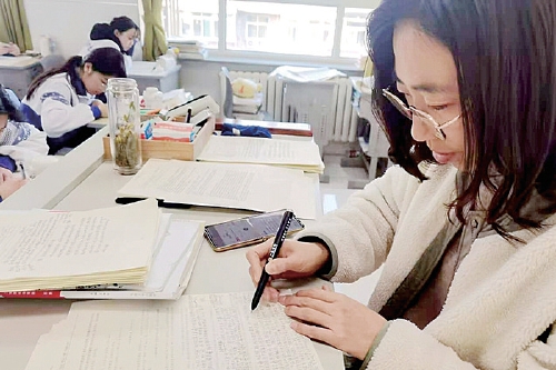 语文老师正在批改学生的“研学路线”。