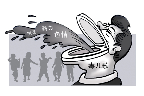 前段时间,有网友反映称,自己用网络电视给孩子播放儿歌时,竟然出现了一首改编的儿歌,歌词让人感到不适。记者近日调查发现,类似家长口中的“毒儿歌”并非个例。一些儿歌中或掺杂脏话,或宣扬暴力,或带色情词汇,还有的歌词怪异,让不少家长直言毁“三观”。(3月21日《法治日报》)