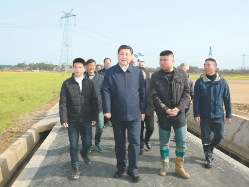 3月18日至21日,中共中央总书记、国家主席、中央军委主席习近平在湖南考察。这是19日下午,习近平在常德市鼎城区谢家铺镇港中坪村,同种粮大户、农技人员、基层干部亲切交流。 (新华社记者 鞠鹏 摄)