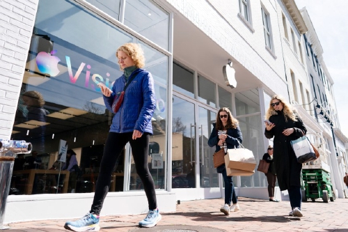 3月21日,行人走过美国首都华盛顿的一家苹果门店。美国司法部21日对苹果公司发起反垄断诉讼,指控这家科技巨头涉嫌存在垄断行为,对消费者、开发者和竞争对手企业利益造成损害。