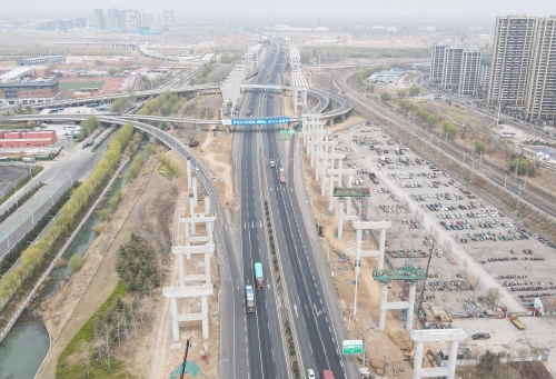3月24日,在京台高速公路济南至齐河段改扩建项目施工现场,济南国际医学中心立交桥南侧的箱梁吊装工作已开始,立交桥南北两侧已建起高约30米的高架墩柱近百座,提前浇筑好的横梁吊装在墩柱上。京台高速公路拓宽的路段经过这里时,将整体抬高架设高架桥梁,桥下从南向北依次跨越小清河南路、小清河、京沪铁路等,为保障桥下的铁路通行安全,采用高架桥梁为列车通行留出足够空间。