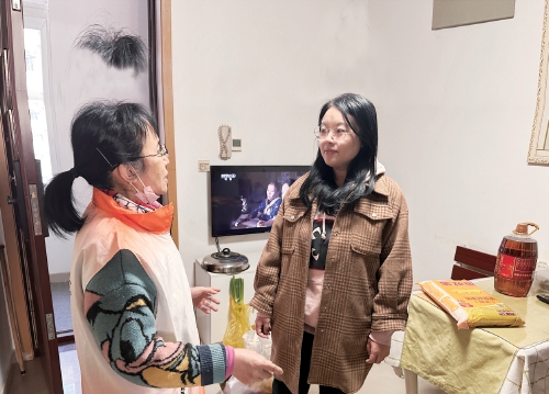 王扬(右)到志愿者家中走访。 (李冬阳 摄)