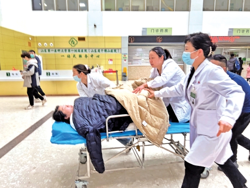 2月14日9点24分,郭伟(前右一)主任、王婷医生和门诊护士推着孙秀诗向手术室飞奔。(徐雁 摄)