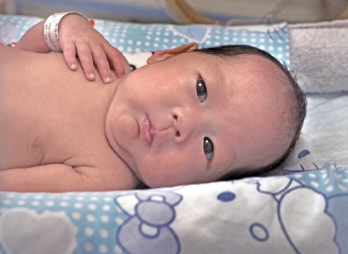 3月19日10点39分,老大芊芊在新生儿病房暖箱里睁开双眼,凝神注视着前方。