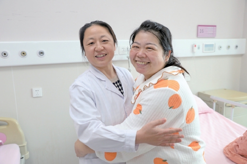 2月19日13点16分,即将从产科病房出院的孙秀诗与王婷医生拥抱告别。