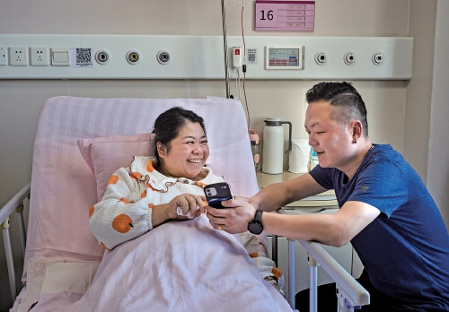 2月17日11点05分,双胞胎的父亲王帅和母亲孙秀诗在产科病房,在手机上欣赏新生儿科护士发来的宝宝照片。