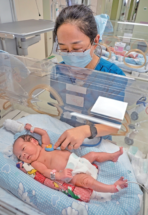 3月19日10点30分,新生儿科主任徐海燕在为双胞胎姐妹检查心肺功能。