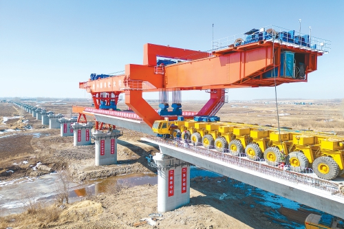 当日,在位于黑龙江省绥化市庆安县的哈伊高铁哈尔滨至铁力段施工现场,历时近1小时的架梁作业后,长32米、重约750吨的箱梁稳稳架设在安邦河特大桥桥墩上,标志着哈伊高铁哈铁段建设进入架梁施工阶段。哈伊高铁是我国“八纵八横”高铁网京哈—京港澳通道的延长线,起自哈尔滨市,途经绥化市,终至伊春市,正线全长318公里,设计时速250公里,是我国在建纬度最高、全线所处地区全年温差最大、首条穿越多年岛状冻土区的高速铁路。 (新华社发)