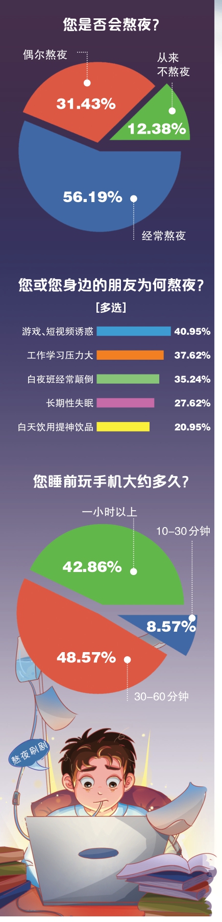 一份有近2.4万人参与的微博投票显示,截至3月24日,关于熬夜,选择“主动熬夜”的有1万票,选择“被动失眠”的有4893票,选择“两者都有”的有7317票,而选择“作息正常”的仅有1024票。在相关话题下,有网友表示“主动熬夜起码是自愿的”“‘打工人’的白天不属于自己,晚上不多熬一会儿都觉得过意不去”“熬夜就是痛并快乐着”。