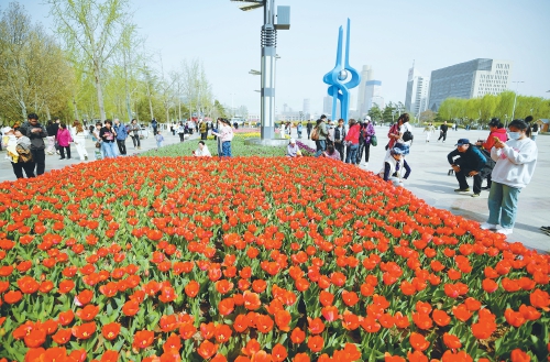 据了解,今年泉城广场和万象城门前的广场绿地共栽植近10个品种的郁金香,面积达2480平方米,栽植数量达17.86万株。 (本报记者 崔健 摄)