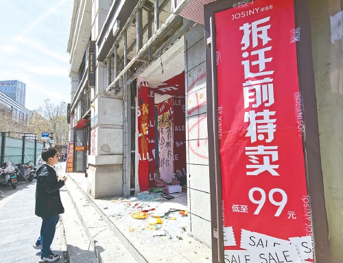 3月30日,在济南洪楼广场西侧,沿街的多个商铺在进行拆迁前的降价促销,建筑墙体上也开始安装施工围挡。记者看到,位于洪楼商圈的临街商业房业户陆续搬迁,部分平房已经开始拆除。据了解,今年洪楼广场片区一期城市更新项目国有土地上的房屋开始实施征收,征收范围内的商户和居民正在有序搬迁。 (本报记者 崔健 摄)