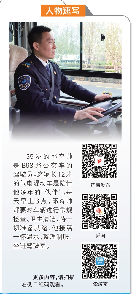 这位朴实又腼腆的驾驶员,刚刚获得全国“最美公交司机”的荣誉。济南日报记者通过邱奇帅的工作日常,寻找着这种“美”。
