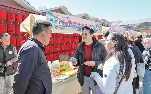 有着“面包王”美誉的北京义利,开创二锅头品类的北京红星,被誉为“津门三绝”之一的桂发祥十八街麻花,国内鼻烟文化的代表品牌益德成,山西著名的特产品牌荣欣堂太谷饼,传承千年怀药食养文化的河南怀山堂,御膳美味、有天下第一鸡称誉的德州扒鸡,以大米干饭把子肉闻名的济南超意兴,山东煎饼的代表品牌野风酥……景区导游向外国游客一一介绍,并热情地邀请他们现场品尝体验。