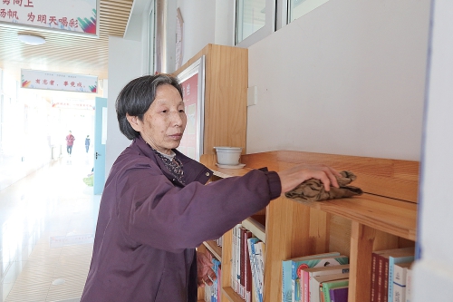 早上,孙元金小心翼翼扶着母亲走进校园,经过的学生们会热情地与这位奶奶打招呼;孙元金上课的时候,办公室里其他老师也会帮着照看老人;学校的保安会主动提醒老人注意安全;老人自己也闲不住,走廊上总能看到她的身影:拿着抹布一遍遍擦拭窗户和书架,楼道也被打扫得干净敞亮。