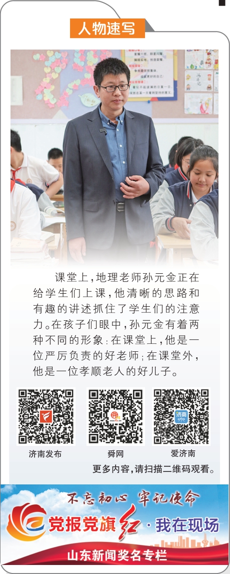 4月7日,济南市长清区第二初级中学的一间办公室里,教师孙元金抬眼看了看墙上的钟表,合上备课本,准备去教室上课。偌大的办公室里,一眼望去就能看到他与其他教师的不同。因为在他身后的小马扎上,坐着他的母亲,一位71岁的老人。