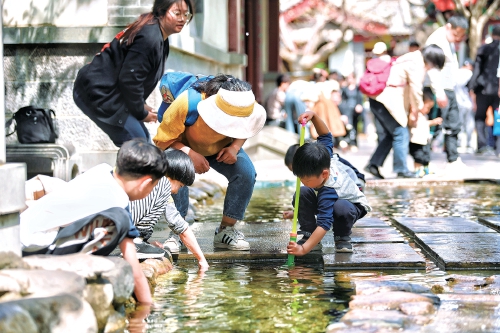 昨日,泉城中午的气温达到27℃,记者在趵突泉公园看到,不少家长带着孩子在公园石板路旁边的水洼处戏水,感受春天的气息。过路市民游客拿出手机,记录下这童真的瞬间。 (王汗冰 摄)