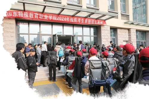 这是学院2024年残疾考生单独招生考试的现场。作为山东省唯一一所公办特殊教育高职院校,学院面向全国开展残疾考生单独招生考试。这是教育部批准的国家一类考试,相当于这些特殊孩子的“高考”。这对特别的他们而言,是一次难得的提升学历、学习专业技能的机会。