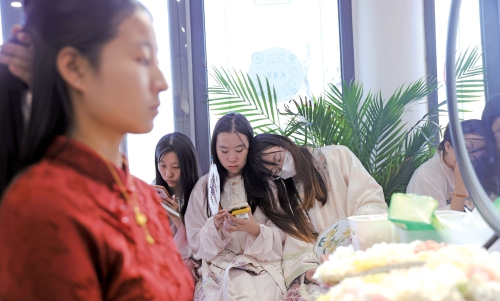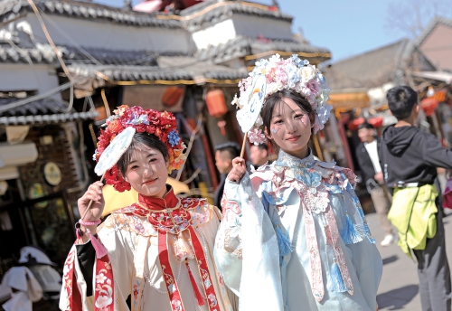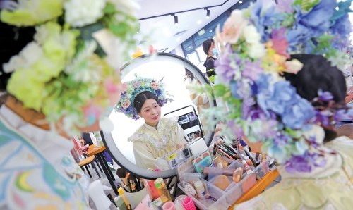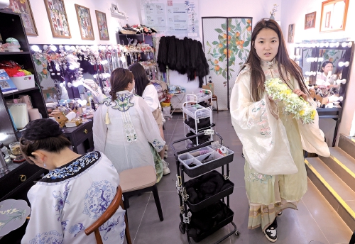 马萌萌说,如今传统文化服饰越来越受大众欢迎,作为汉服从业者,她很开心也很骄傲。其实,簪花不仅是一种风俗,游客们在感受传统文化魅力的同时,更是一种对幸福生活的表达和期待。(本报记者 赵晓明 摄影报道)