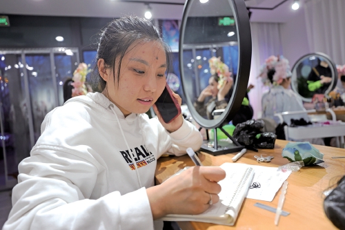 晚上7点,店长马萌萌仍在记录预约簪花妆的订单。