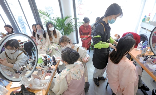 “‘簪花’的风去年夏天就吹到了济南,随着现在春暖花开,每天来做簪花妆造的顾客越来越多,进店的顾客90%都是冲着簪花造型来的。从上午9点开门,就没有停歇过。今天周三,本周的预约已经满了,只能约下周了。”“店里的簪花头饰只有20多个,做一个精致的簪花妆造需要1个小时左右,所以很多顾客都是提前几天预约,为了节省时间,有的顾客还会在做造型的前一天来店里挑选服装和簪花。”在济南百花洲附近一家汉服造型店内,店长马萌萌一边整理顾客选好的簪花一边说。