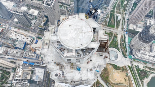 4月9日,在济南中央商务区“五指山”超高层建筑之一的绿地山东国金中心428米超高层项目,主塔楼外平台混凝土施工至屋面层,内平台屋面层混凝土已经完成,核心筒塔冠部分停机坪混凝土施工完成,标高已经达到了428米,整个停机坪外观已经初步显现,这是山东省内建筑顶层最高的停机坪。截至目前,建筑幕墙东立面和南立面已经施工至82层,北立面施工至81层,正在向着顶层冲刺。 (王锋 摄)