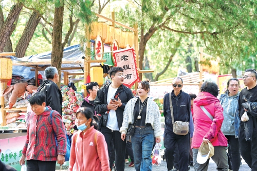 庙会市集上,从吹糖人、麦秆画、葫芦烙画、核雕砚雕等传统的手工艺品,到发簪、团扇、布偶、玩具等现代的手造文创,琳琅满目,应有尽有,吸引众多游客驻足欣赏、购买。当然,除了“看大戏”“赏民俗”之外,“品小吃”也是必选项,冰糖葫芦、泉水茶汤、黄家烤肉等各类风味小吃汇聚一堂,色香味俱佳,让人垂涎欲滴。