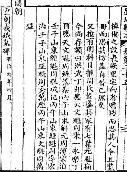 明科目推周氏最盛,其家有七叶元魁扁,今尚存。额曰:洪武丁卯应天文魁周秉一;永乐丁酉应天文魁周鐩;景泰丙子山东解元周溥;弘治壬子山东经魁周程;成化丙午山东经魁周导;弘治壬子山东亚魁周秀;万历丙午山东文魁周万镒。