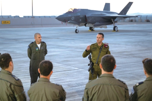 4月15日,以色列国防军总参谋长哈莱维(后)在以色列南部的内瓦提姆空军基地讲话。(新华社发)