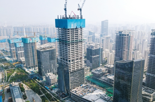 信泰中心超高层建筑位于济南CBD核心区。该项目T1塔楼总高度约326米,共64层,代表济南CBD“山、河、湖、泉、城”五座超高层建筑中“城”元素,建成后将成为济南CBD第三高楼。作为“城”之代表,该项目的造型十分具有特色,融入了中国古代城市传统元素。高低起伏的顶部结构模仿了中国传统建筑的屋顶,幕墙的设置也犹如中国古代城砖。(本报记者 崔健 摄)
