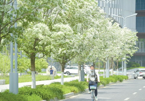 4月19日,在济南中央商务区荷花湖东侧,道路两旁种植的流苏树已迎来盛花期,洁白如雪的流苏花开满树冠,随风拂动花香四溢,成为济南CBD绸带公园内一道亮丽的风景线,吸引了不少市民驻足欣赏。(本报记者 崔健 摄)