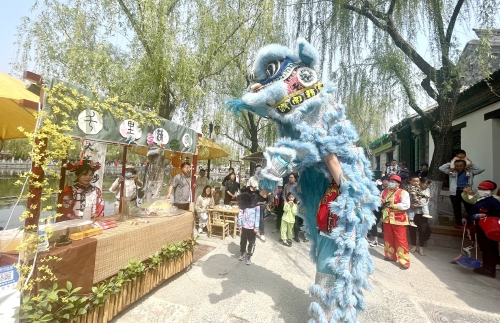 4月20日,经过提升改造的济南百花洲历史文化街区迎来重启观光后的首个周末。记者在现场看到,精彩的舞狮表演为市集上的开业商家送去祝福,吸引了众多市民游客打卡拍照,讨个好彩头。