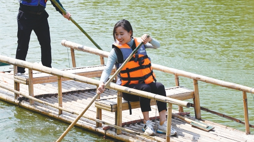 穿过竹林就能看见一片水面,岸边停靠着几排竹筏。眼前的美景让人忍不住边掏出手机拍摄边感叹:“这不就是江南水乡吗?”光赏景还不够尽兴,我们穿上救生衣,踏上竹筏,拿起船桨,也要像古人那样,走进“画”中去。
