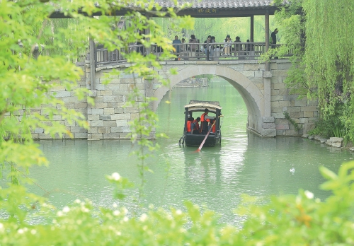 4月21日,游客在济南章丘明水古城游玩。当日,泉城春和景明,气温宜人,明水古城内街巷纵横,河道蜿蜒。游客泛舟古城,身边流水潺潺,垂柳依依,仿佛置身于一幅流动的水墨丹青画卷之中。随着“五一”假期的临近,明水古城将举办“沉醉不知归路”系列活动,让“清照文化、泉水文化”等元素融入游客旅途。 (本报记者 崔健 摄)