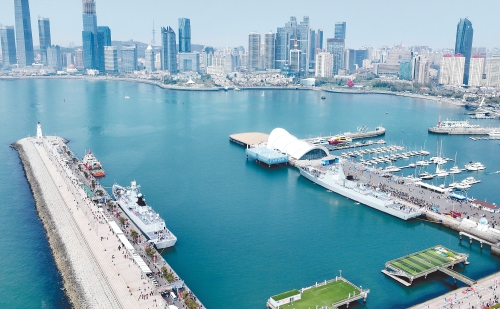 4月22日,青岛奥帆中心码头,观众在参加舰艇开放活动(无人机照片)。连日来,2024年海军成立纪念日舰艇开放活动在青岛举行。开放的舰船多数参加过亚丁湾护航、出国访问、联演联训等重大任务。预约前来参观的市民游客络绎不绝,人们不仅能登舰参观,还能与海军官兵面对面交流、参加军事特色科目体验、了解海军特色文化等,零距离感受人民海军舰艇的风采和魅力。今年4月23日是海军成立75周年纪念日,4月20日至24日,海军在青岛、大连、烟台、上海、厦门、广州、湛江、海口、三亚等地海军部队组织军营开放活动,其中在青岛港3号码头、青岛奥帆中心码头安排6艘舰船向社会公众开放。(新华社发)