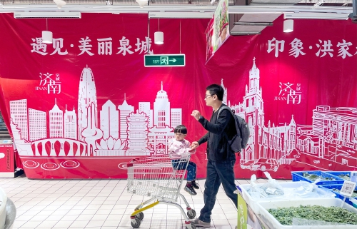 4月22日,在花园路东段的大润发历城店,整体搬迁工作已经悄然启动。在卖场的三层生鲜区域,原来经营生肉、水产的摊位已经搬离,货架和柜台已经拆除,原来的经营区域用红色的喷绘布围挡起来,不少设置在过道区域的促销展示台也相继撤离。据了解,纳入征收范围的大润发历城店,分批分阶段进行搬迁,首批搬迁的是仓储区和三层生鲜区,其他区域目前正常营业。(王锋 摄)