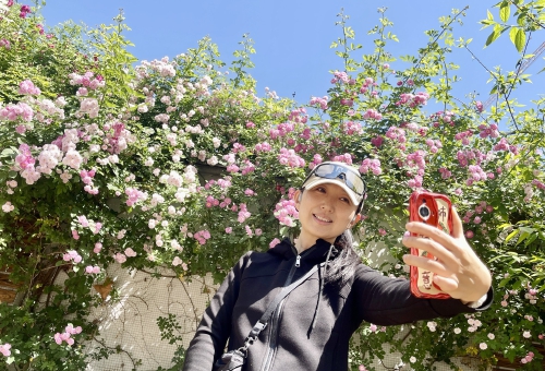 4月24日,市民在济南经十路建设路路口附近口袋公园欣赏美丽的蔷薇花。春风吹满枝,济南蔷薇花悄然绽放,让人见之难以忘怀。4月底5月初,正是蔷薇的盛花期,粉嫩的蔷薇满墙盛开,肆意而又绚烂,济南的街角处处满是春意盎然,吸引过往路人打卡、拍照。(本报记者 赵晓明 摄)