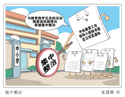 为切实减轻中小学教师非教育教学负担,中央教育工作领导小组秘书组近日印发通知,对开展规范社会事务进校园为中小学教师减负专项整治工作作出部署,要求集中整治与教育教学无关的活动和工作随意进入校园情况,以及社会事务进校园过程中重留痕轻实效的形式主义,营造教育教学良好环境。 (4月25日《新华每日电讯》)